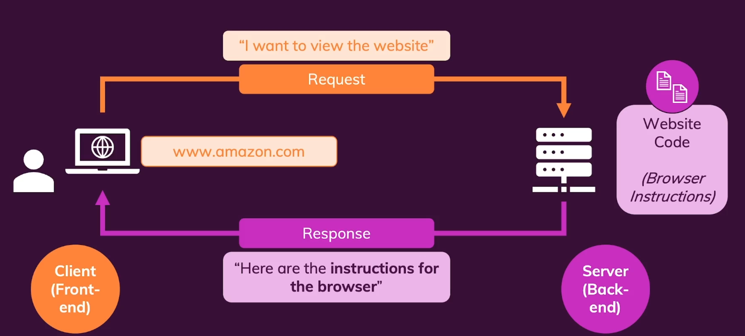 사용자들이 휴대폰이나 노트북 또는 컴퓨터를 이용하여 주소를 입력하면 브라우저는 원격 컴퓨터 즉, 서버에 요청을 보내게 되는데 서버는 HTML, CSS, 자바스크립트 코드를 저장하고 응답과 함께 브라우저로 다시 전송한다.