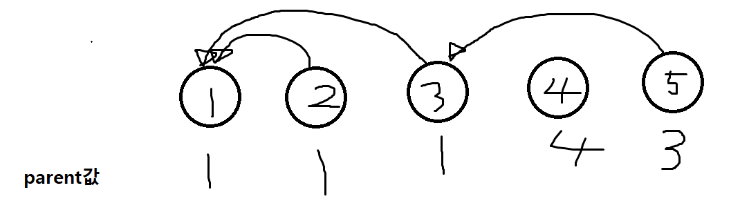2의 부모값을 1로 바꿔준다. -> 바꿔줄 때 부모 값이 작은 쪽이 부모가 되도록 해야한다.