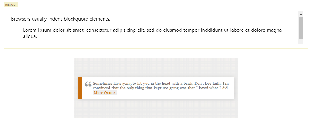 긴 인용문 블록을 지정한다. 브라우저는 blockquote 요소를 들여쓰기한다. css를 이용하여 다양한 style을 적용할 수 있다.