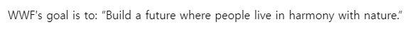<p>WWF's goal is to: <q>Build a future where people live in harmony with nature.</q></p>