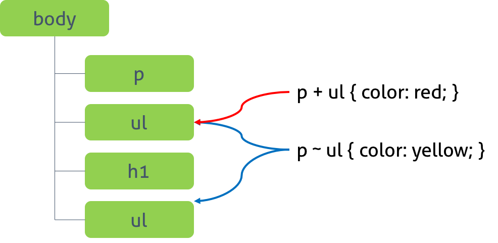 /* p 요소의 형제 요소 중에 p 요소 바로 뒤에 위치하는 ul 요소를 선택한다. */