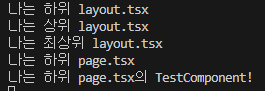 페이지 컴포넌트 내에서 console.log("나는 하위 page.tsx")가 실행되고, 그 다음에 페이지를 감싸는 레이아웃 컴포넌트(TestLayout)의 로직이 실행됩니다.