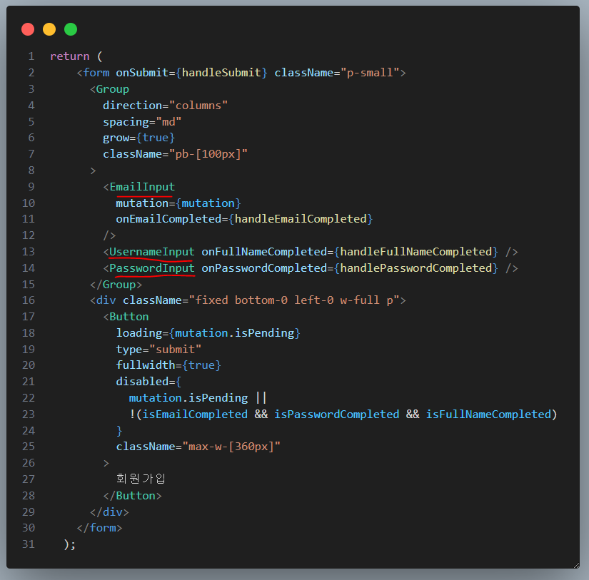 간단하게 설명하면 각 Input들을 컴포넌트로 나누고 각 컴포넌트 마다의 Validation이나 onChange 기능을 수행했다.