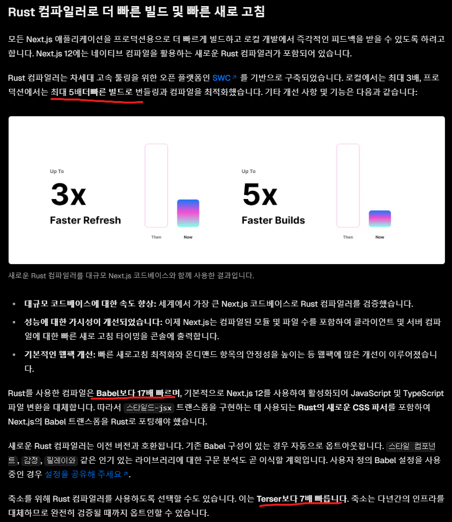 NextJS에서는 SWC를 시반으로 개발한 컴파일러를 통해 기존 빌드에 활용하던 Babel과 Terser을 대체한다.