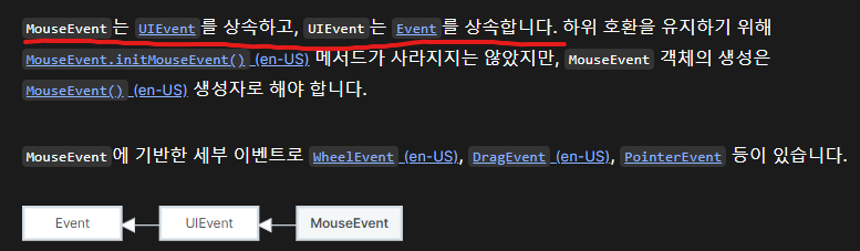 MouseEvent는 UIEvent를 상속하고, UIEvent는 Event를 상속한다 나와있다.