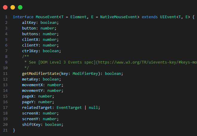 MouseEvent에서 참조하고 있는 NativeMouseEvent는 브라우저의 마우스 이벤트다. MDN에 설명되어 있음