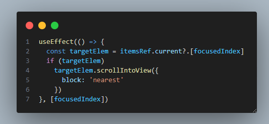 scollIntoView를 통해 focus가 변할 때마다 focus가 된 아이템이 보이도록 스크롤이 움직인다.
