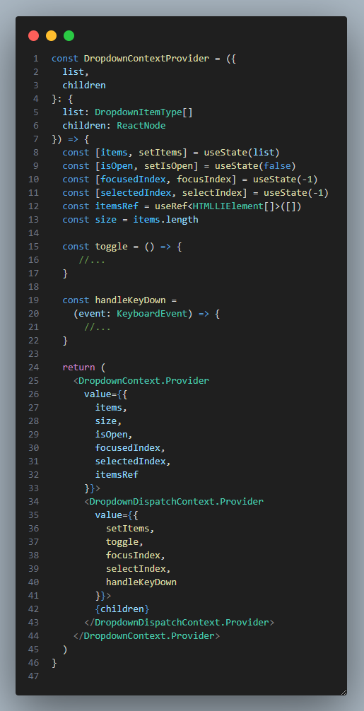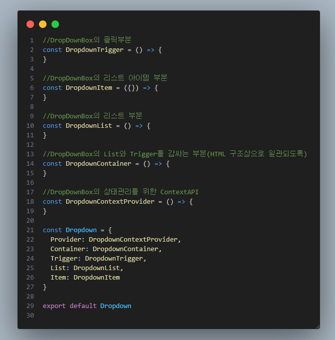 각각 Trigger, List, Item에서 필요한 상태들을 Context API를 이용해서 관리한다.