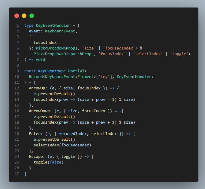 여기서 설명한 매핑함수는 이후 handleKeyDown이라는 함수로 DropDownBox의 Container 컴포넌트에 onKeyDown으로 적용할 것이다.