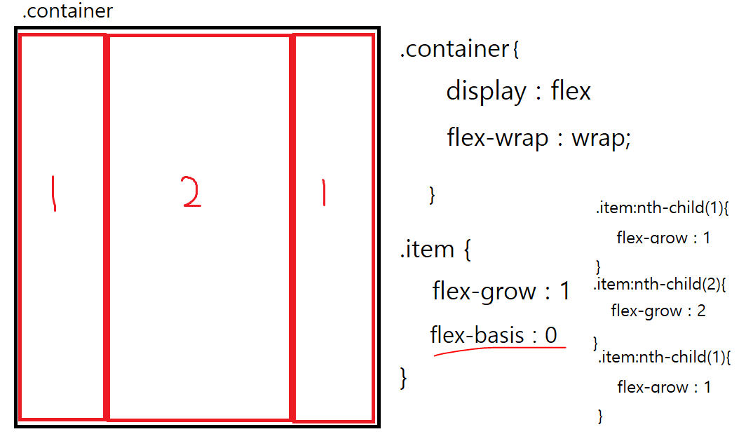 그래서 flex-basis : 0을 주게 되면 우리가 생각했던 1 : 2 : 1의 비율이 된다.