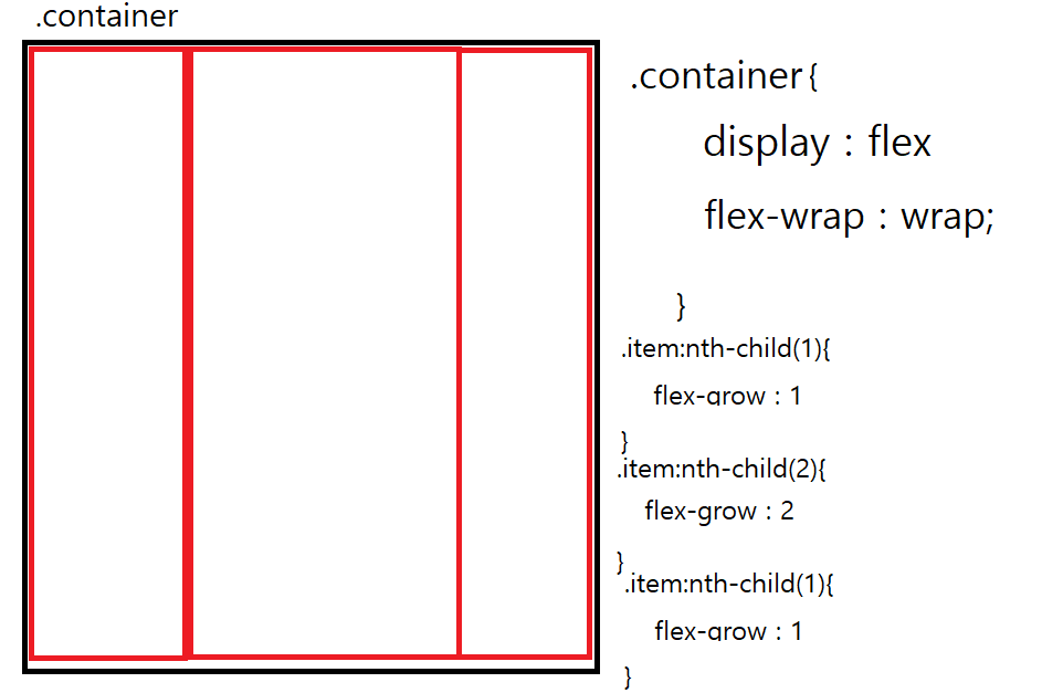 item의 안의 자식요소에게 각각 flex-grow값을 주면 그 비율대로 여백을 1 : 2 : 1로 나눠 가진다는 소리다.