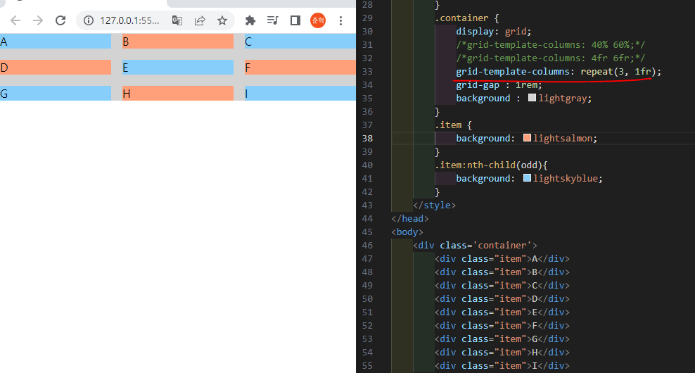 grid-template-columns: repeat(3, 1fr); -> 1fr을 3번 반복한다. -> grid-template-columns: 1fr 1fr 1fr