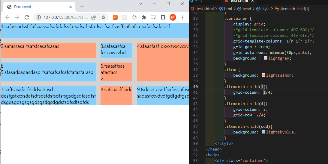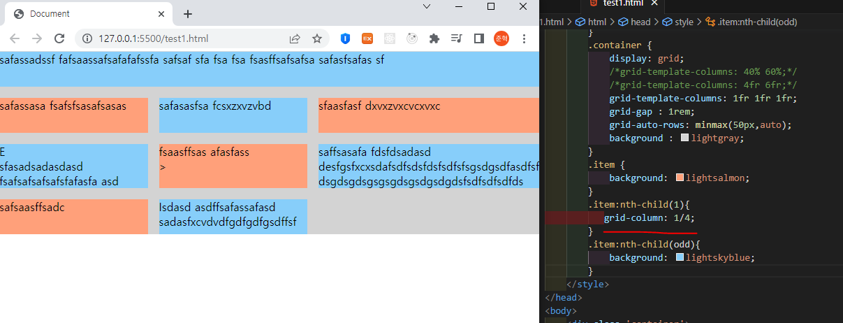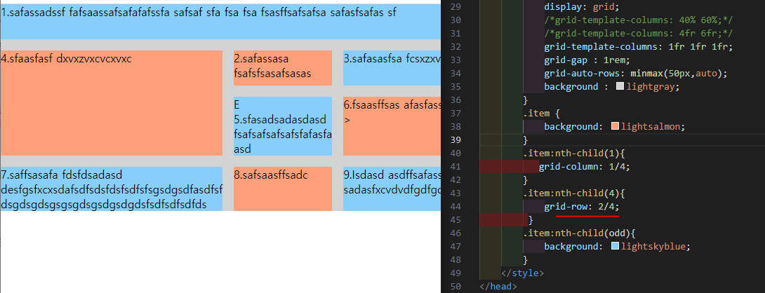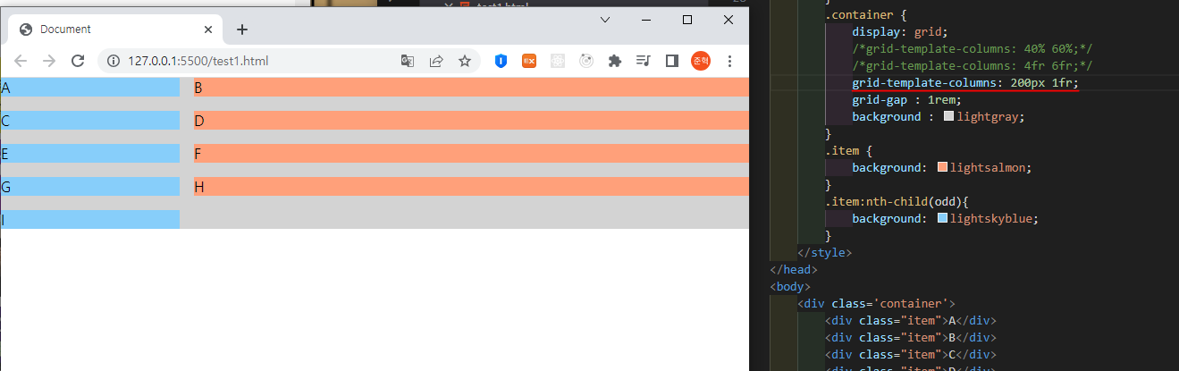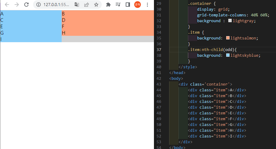 grid-template-columns : 40% 60% : 40% 60%로 나눔 <=> grid-template-columns: 4fr 6fr 이것과 동일하다.