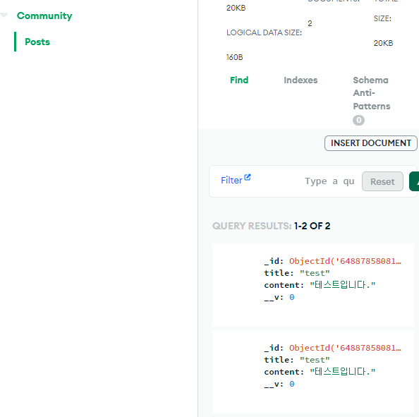 클라이언트에서 axios요청을하면 아래와 같이 몽고DB에 데이터가 잘들어온다.
